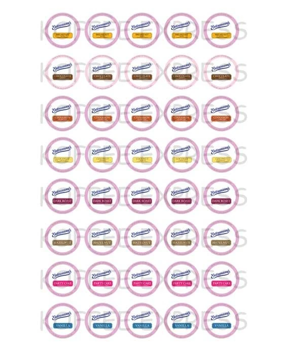 - 5 Breakfast Blend, 5 Dark Roast, 5 Hazelnut, 5 Cinnamon Crumb Cake, 5 Vanilla, 5 Chocolate Donut, 5 Party Cake and 5 Coconut Cream Pie