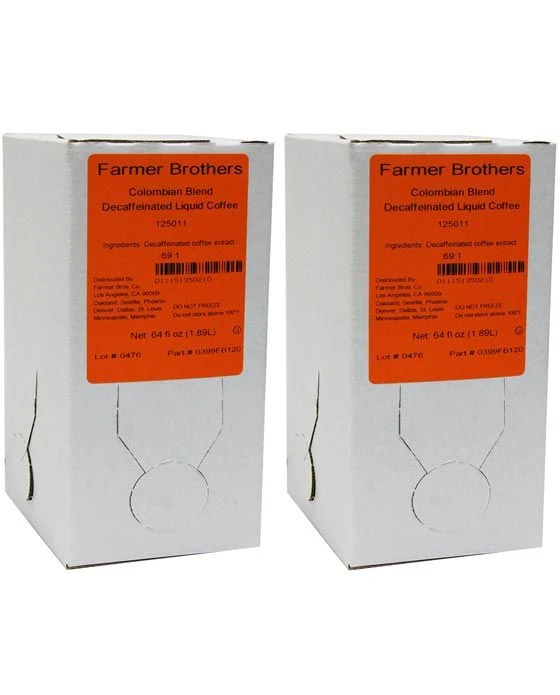 - This sale is for two 64 oz boxes of Farmer Brothers Colombian Blend Decaf Liquid Coffee
